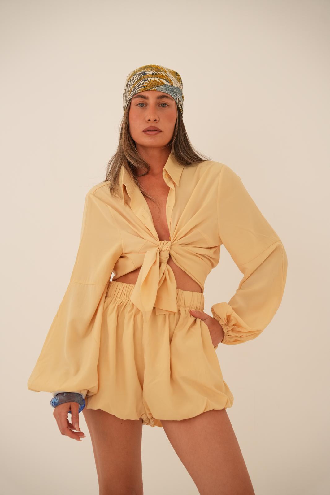 חליפת לומיחליפת מכנס קצר בגזרת בלוןמכנס עם גומי וכיסים בצידי המכנסחולצה מכופתרת עם שרוולים תפוחים...
