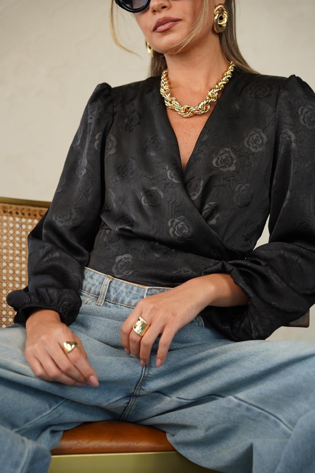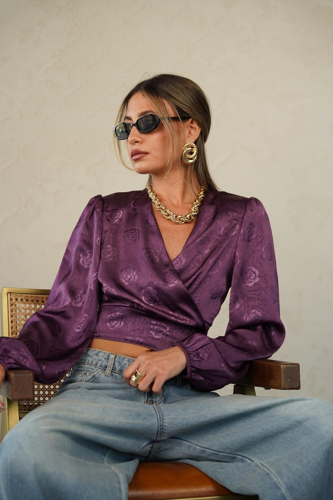 חולצה מבד סאטן עם עיטורים גזרת קרופ מעטפת וי עמוק עם קשירה בגב One size ...