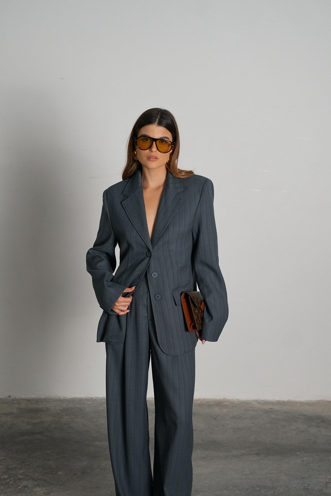 חליפה מחויטת ואלגנטית בת שני חלקים , ג'קט קלאסי שרוול ארוך ומכנס רחב ונשפך עם...