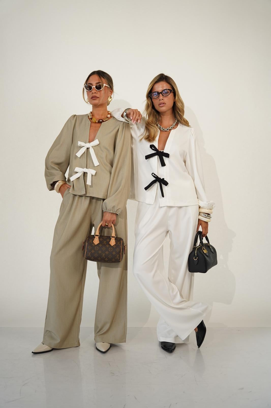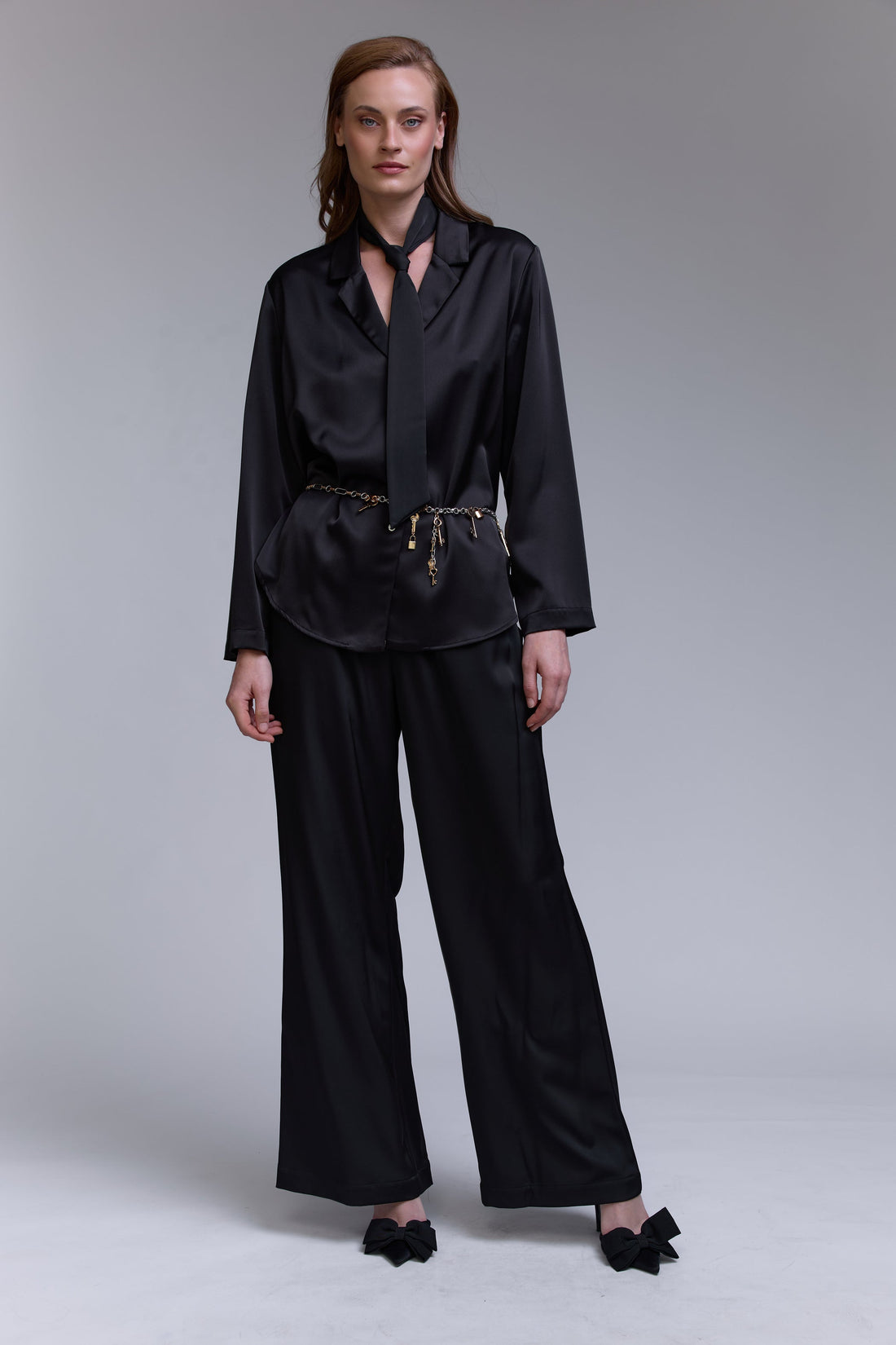 חליפה מבד עשיר מאודמכנס גומי בגזרה ישרה נשפכת חולצה מכופתרת עם קשירה עדינה במנגט החליפה קיימת בשחור...