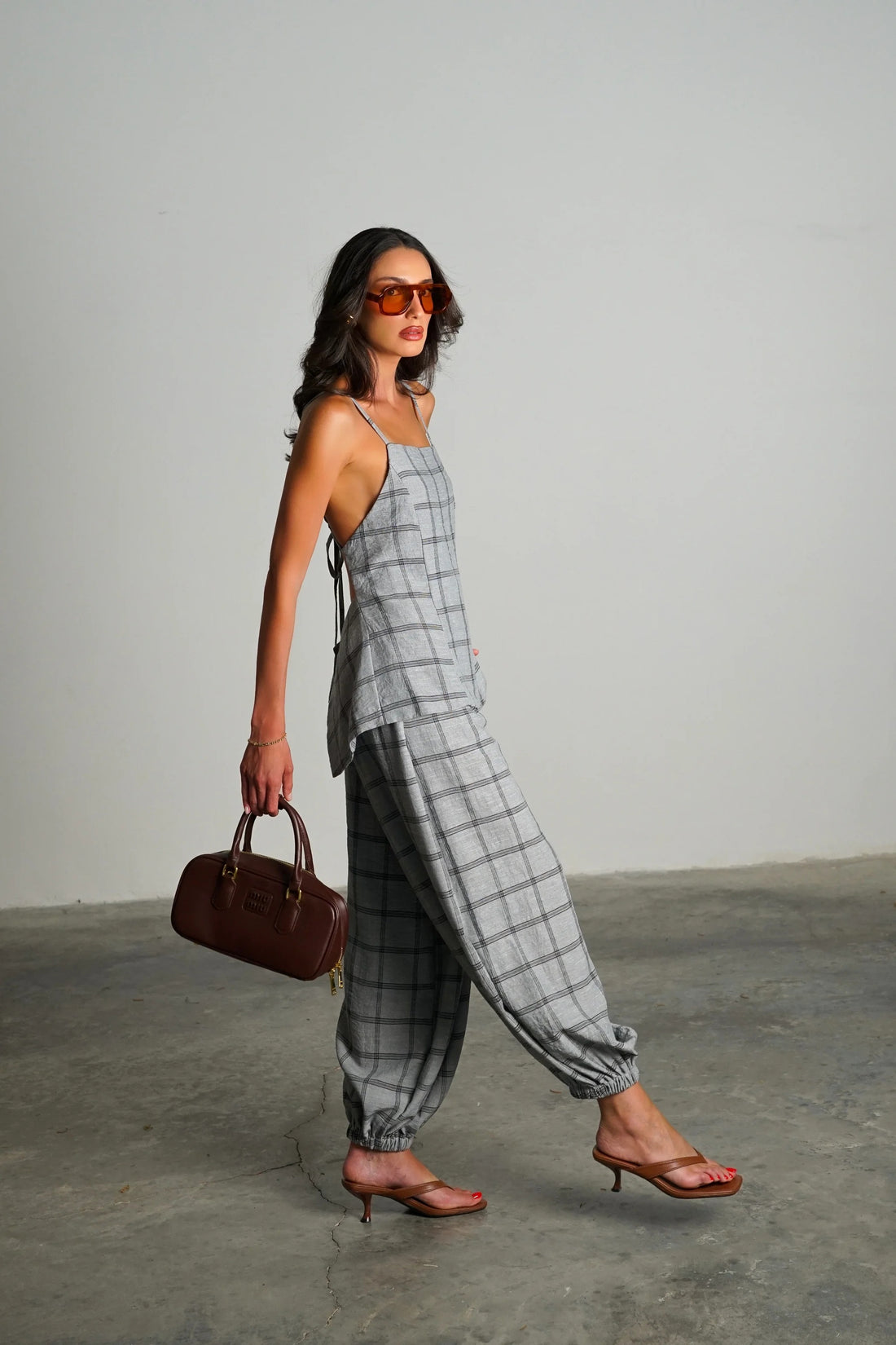 חליפת שני חלקים בהדפס משבצות רחבותגופייה עם כתפיות דקיקות מפתח מרובע ופתח בגב עם קשירה...