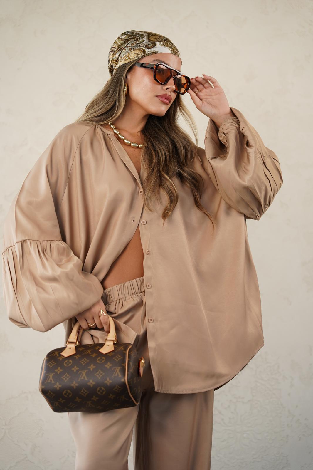 חליפה מבד עשיר ואיכותימכנס גומי בגזרה ישרה חולצה מכופתרת עם שרוול פעמון וגומי