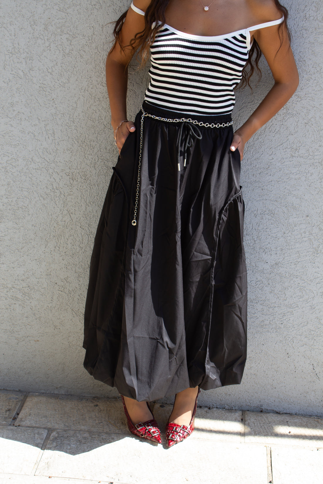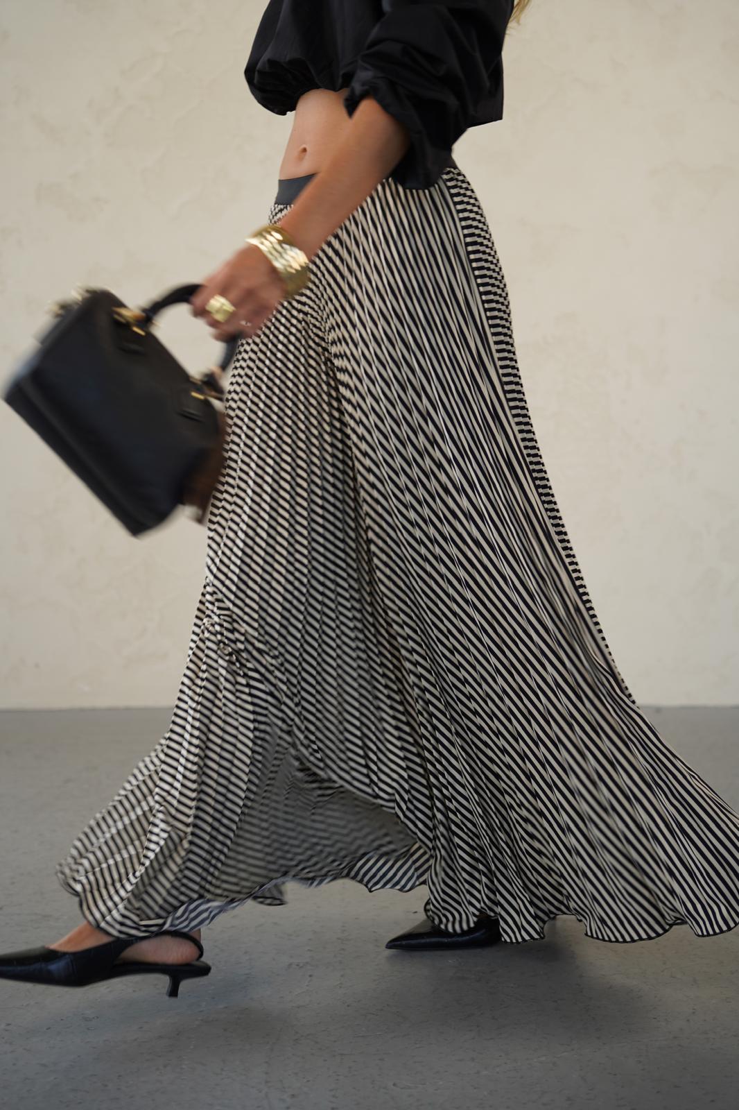חצאית פליסה פסים עשירה מאוד בבדעם גומי במותן באורך מקסי