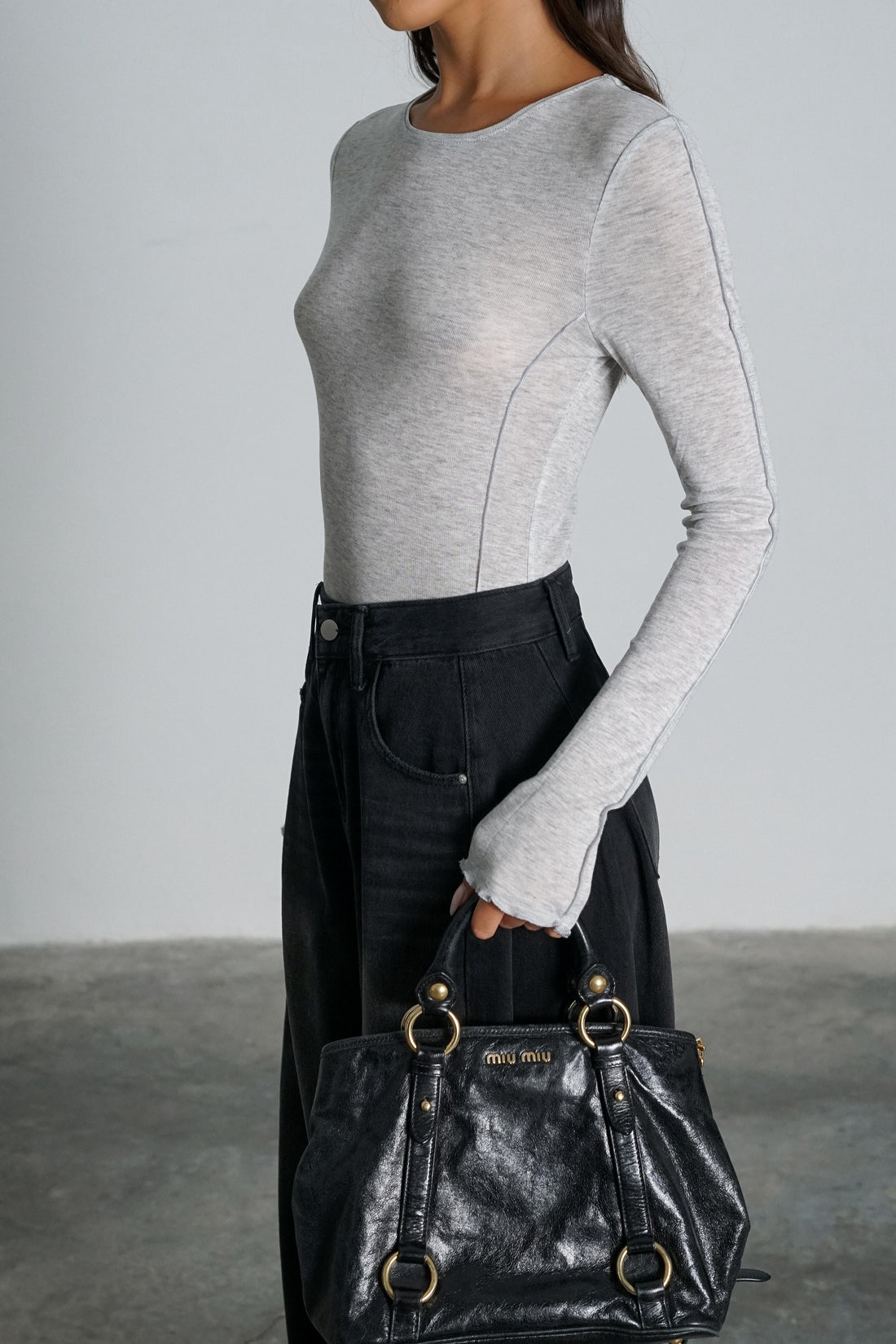חולצת בייסיק קרופ מעוצבת עם מפתח עגול שרוולים ארוכים | כריות בכפתיים