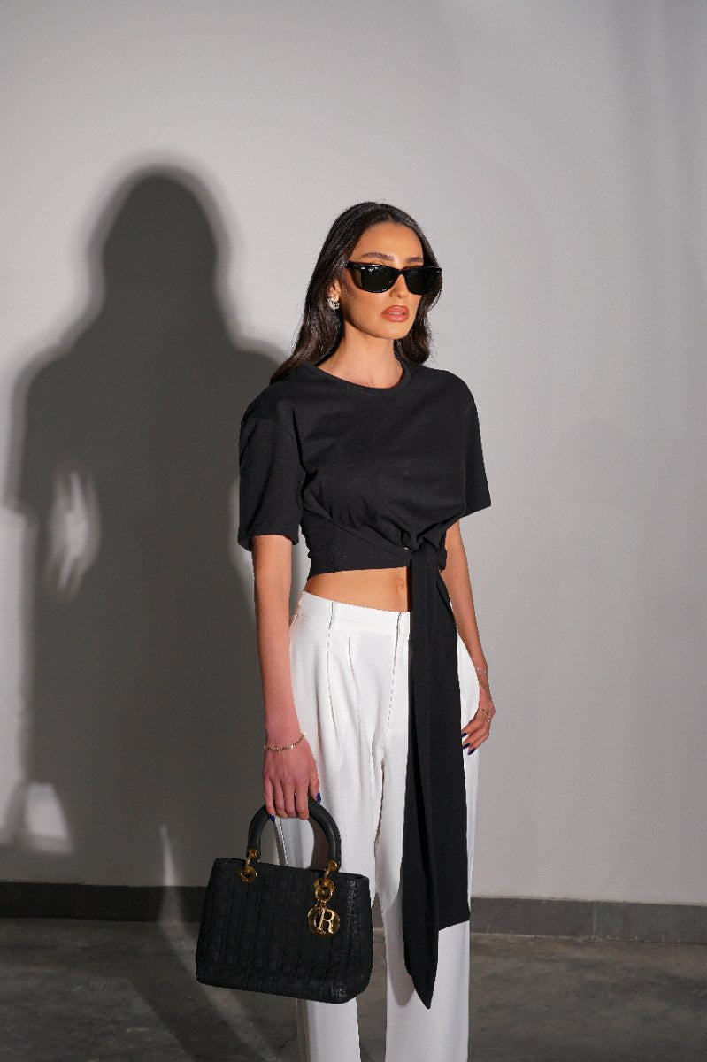 חולצת בייסיק גזרת קרופ עם קשירה במותן