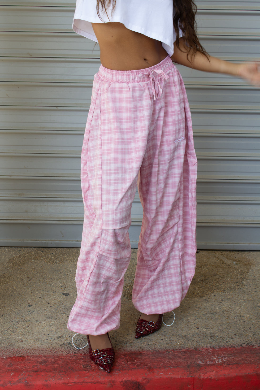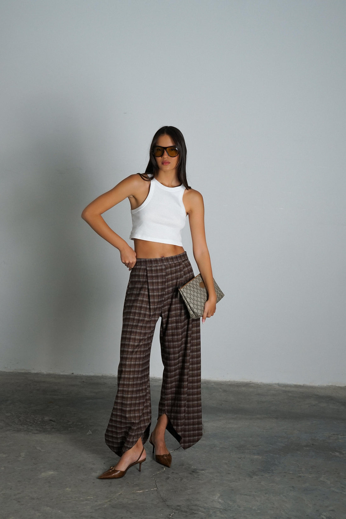 מכנס מבד דק נשפך בדוגמת משבצות המכנס עם גומי במותן גזרת בלון רחבה שרוך גומי...