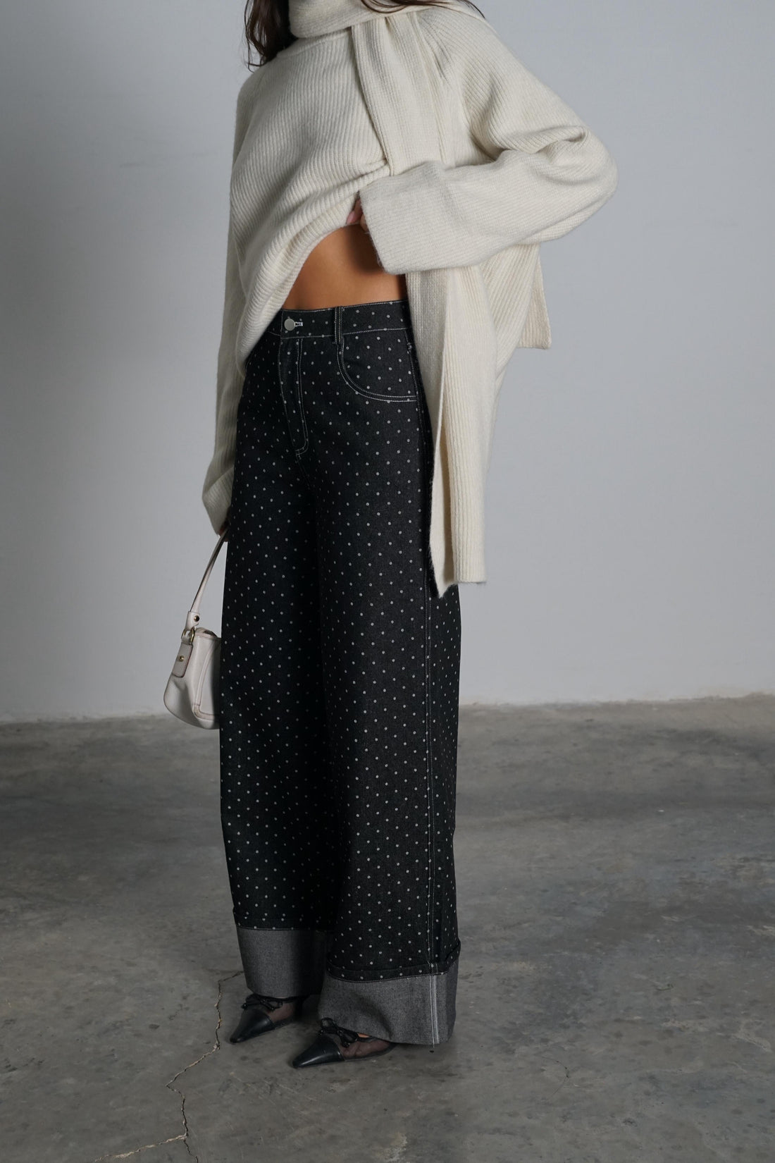 ג׳ינס בגזרה גבוהה ומתרחבת עם הדפס נקודות