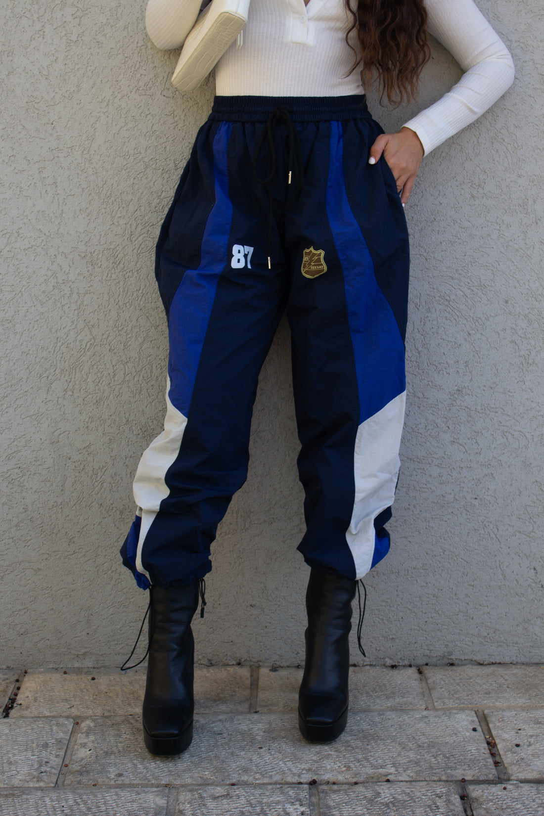 מכנס ניילון בשילוב צבעים גומי במותן וגזרת בלון עם שרוך לכיווץ בסיומת מגיע במידות. הדוגמנית...