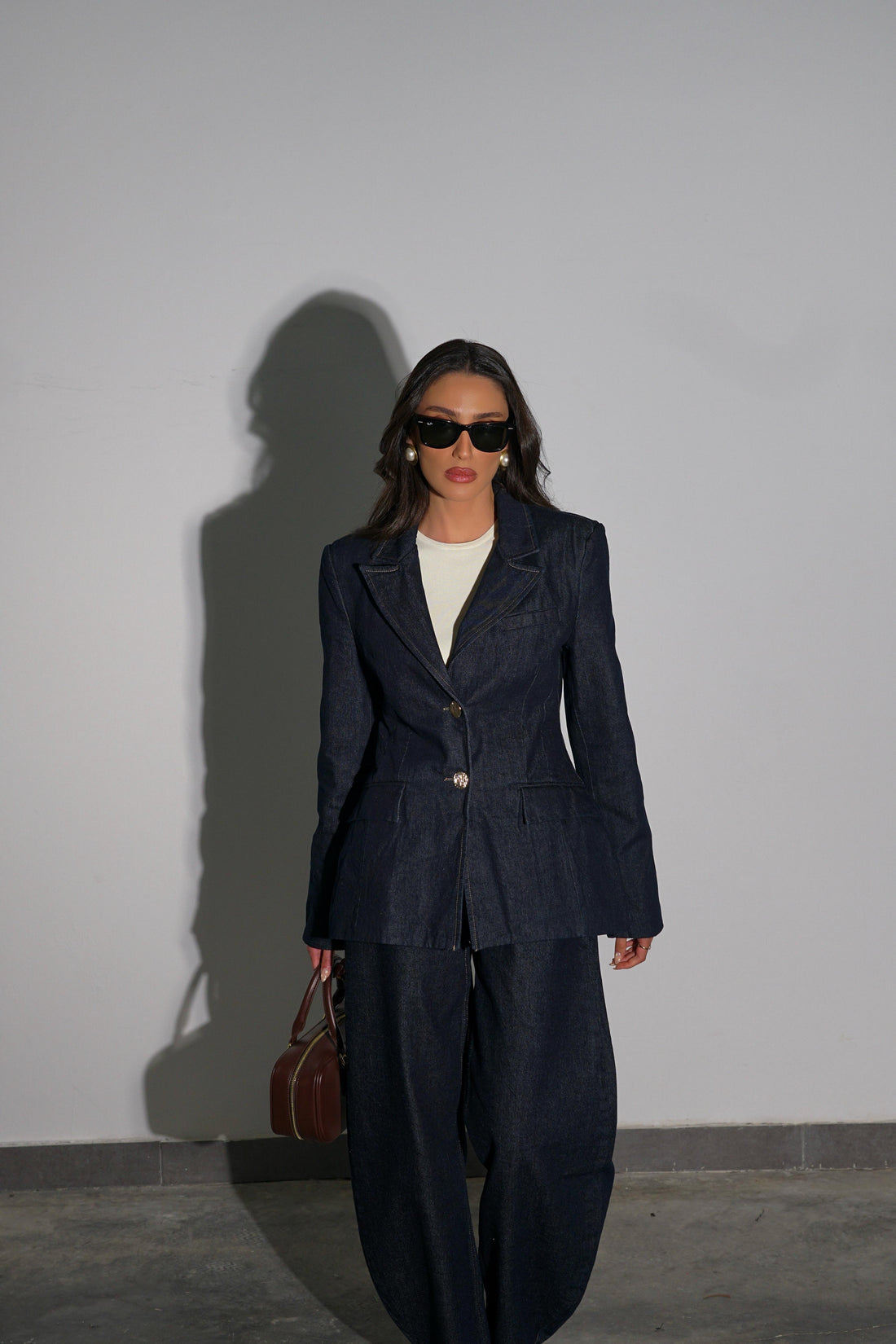 ג׳קט בגזרה מחויטת עם סגירת כפתורים צבע ג׳ינס כהה כריות בכתפיים ניתן ללבוש כסט תואם...