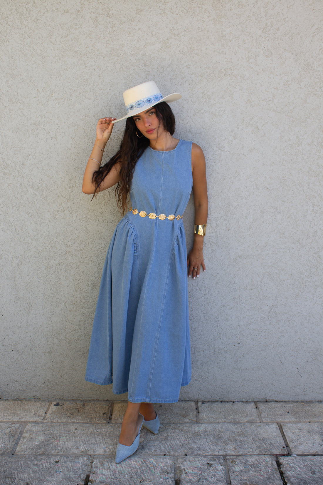 שמלת מידי ג׳ינס מבד קליל כיווצים במותן גב פתוח עם קשירה גובה הדוגמנית 1.60 לובשת...