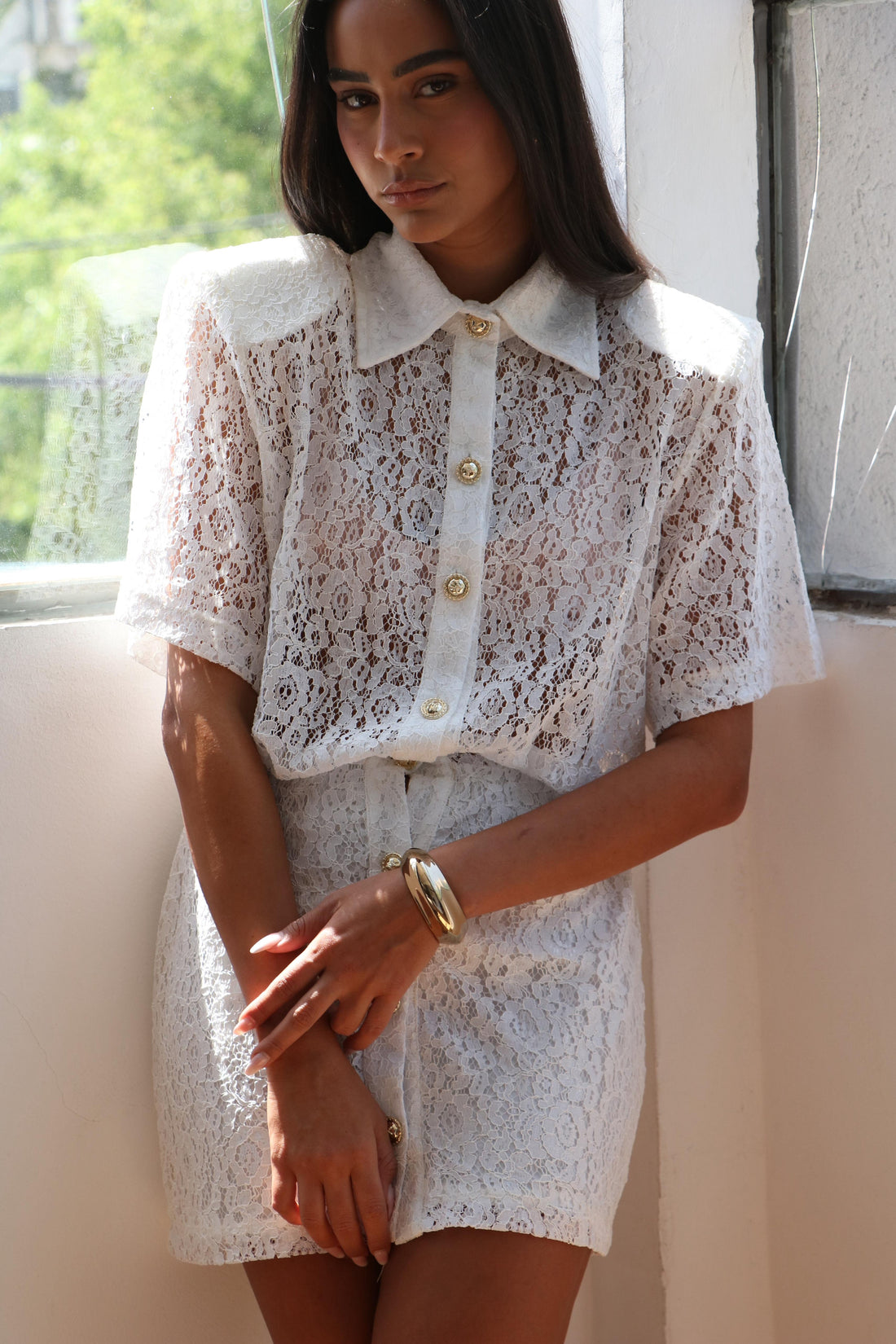 שמלת מיני במראה של חליפת חצאית בחלק העליון חולצת תחרה שקופה עם כריות בכתפיים תפר...