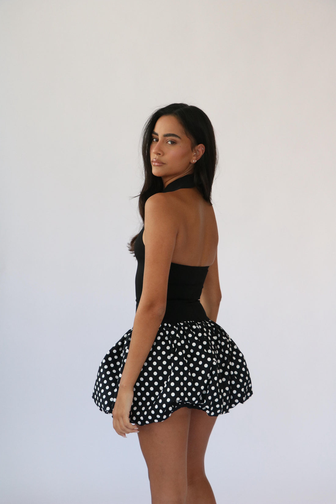 שמלת מיני קצרצרה עם תחתית מכנסון מחובר גזרת סטרפלס עם חצאית קומות גומי מאחורה בד...