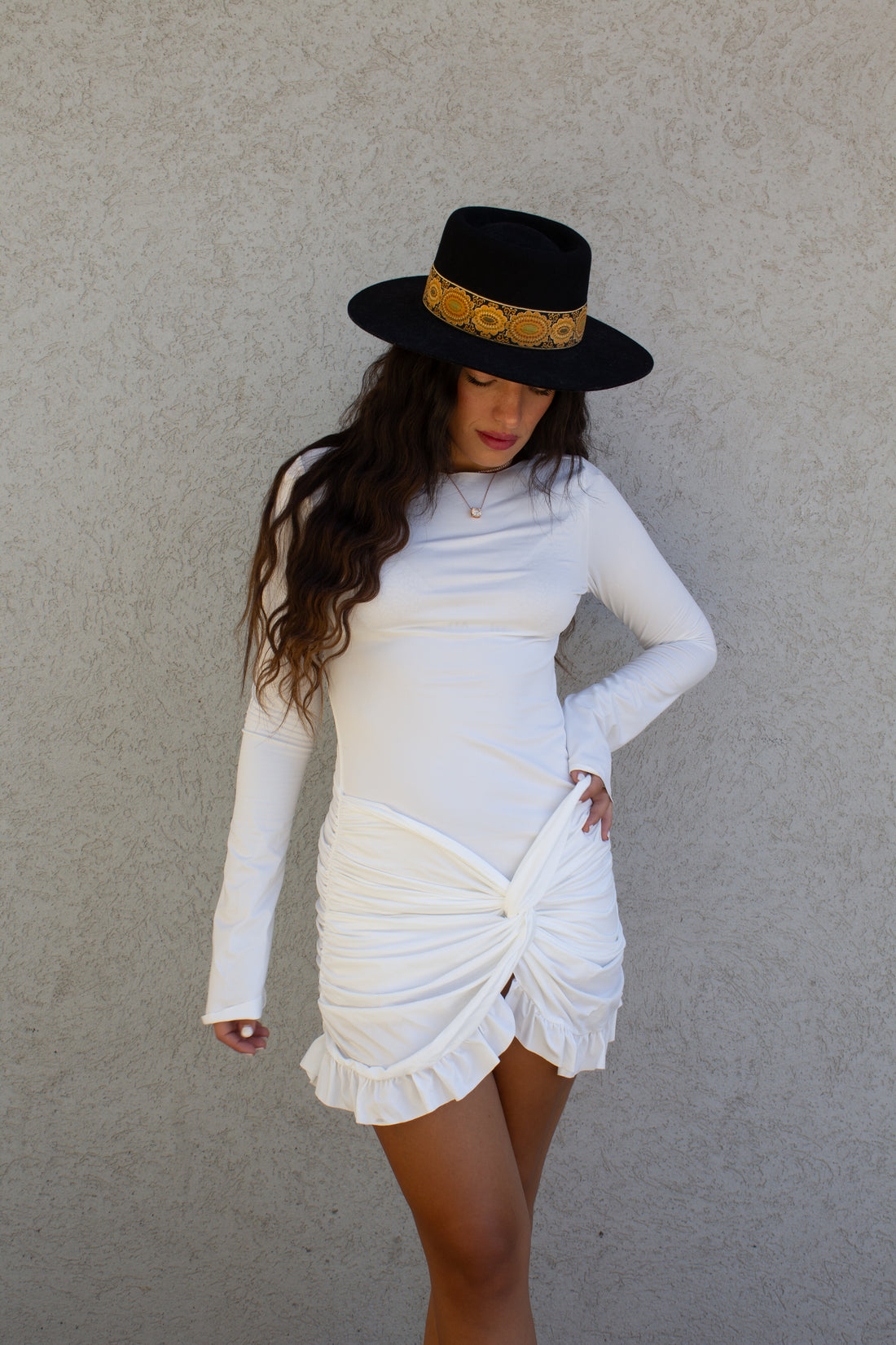 שמלת מיני מבד רקום עם שרוול ארוך מתרחב וגב פתוח מגיעה עם בנדנה תואמת S...