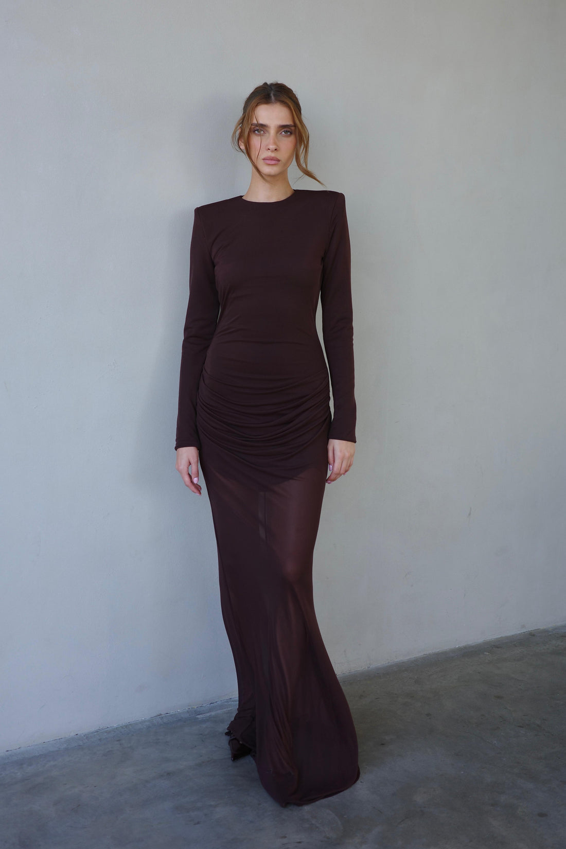 שמלת מקסי קאט אאוט חלק עליון צווארון גולף עם חיתוכים וחיבור לחצאית מקסי גב פתוח ...