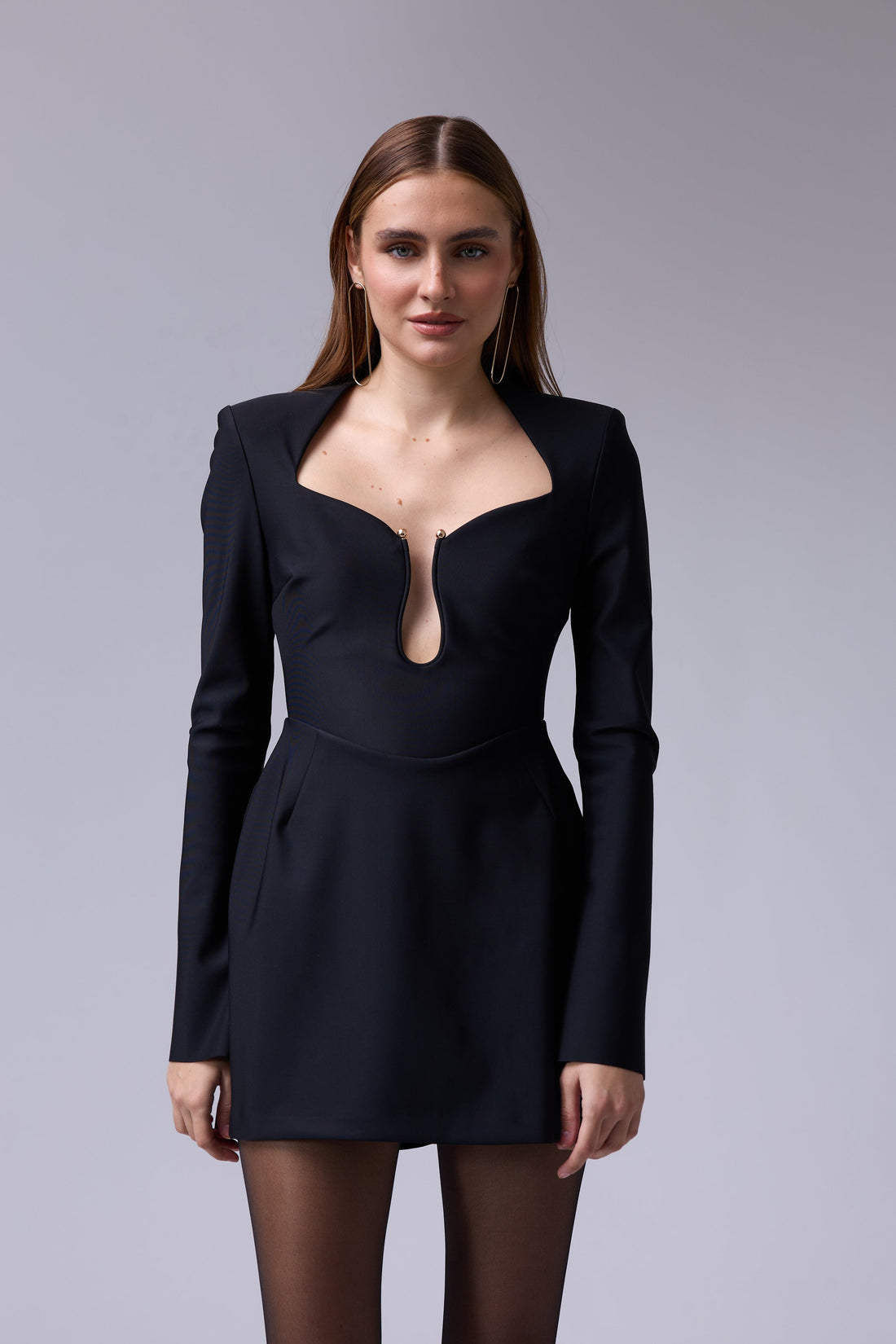 שמלה מיני בגזרת גולף אלגנטית ומחמיאה , עם שרוולים ארוכים ושסע עדין בסיומת . בחלק...
