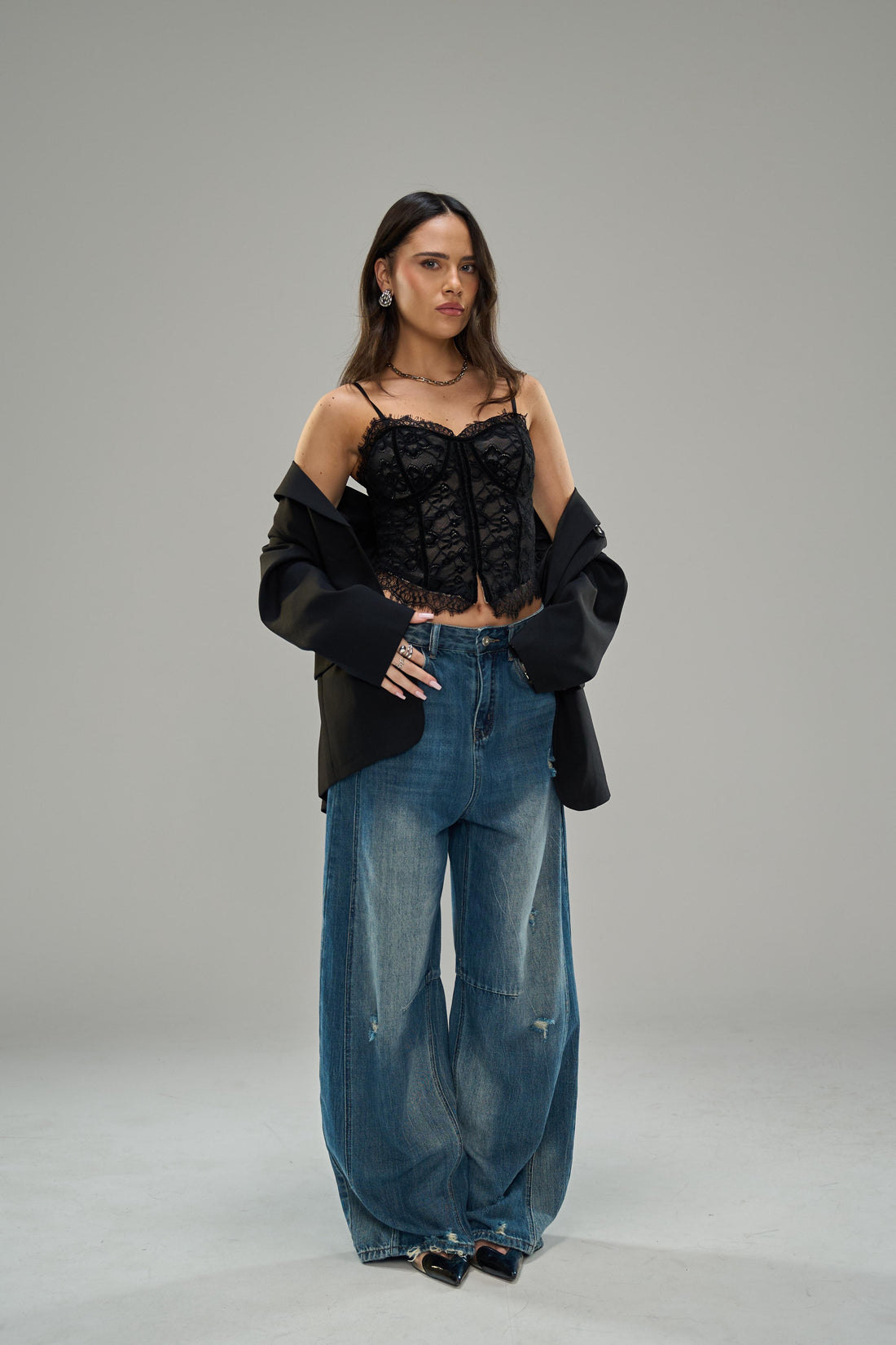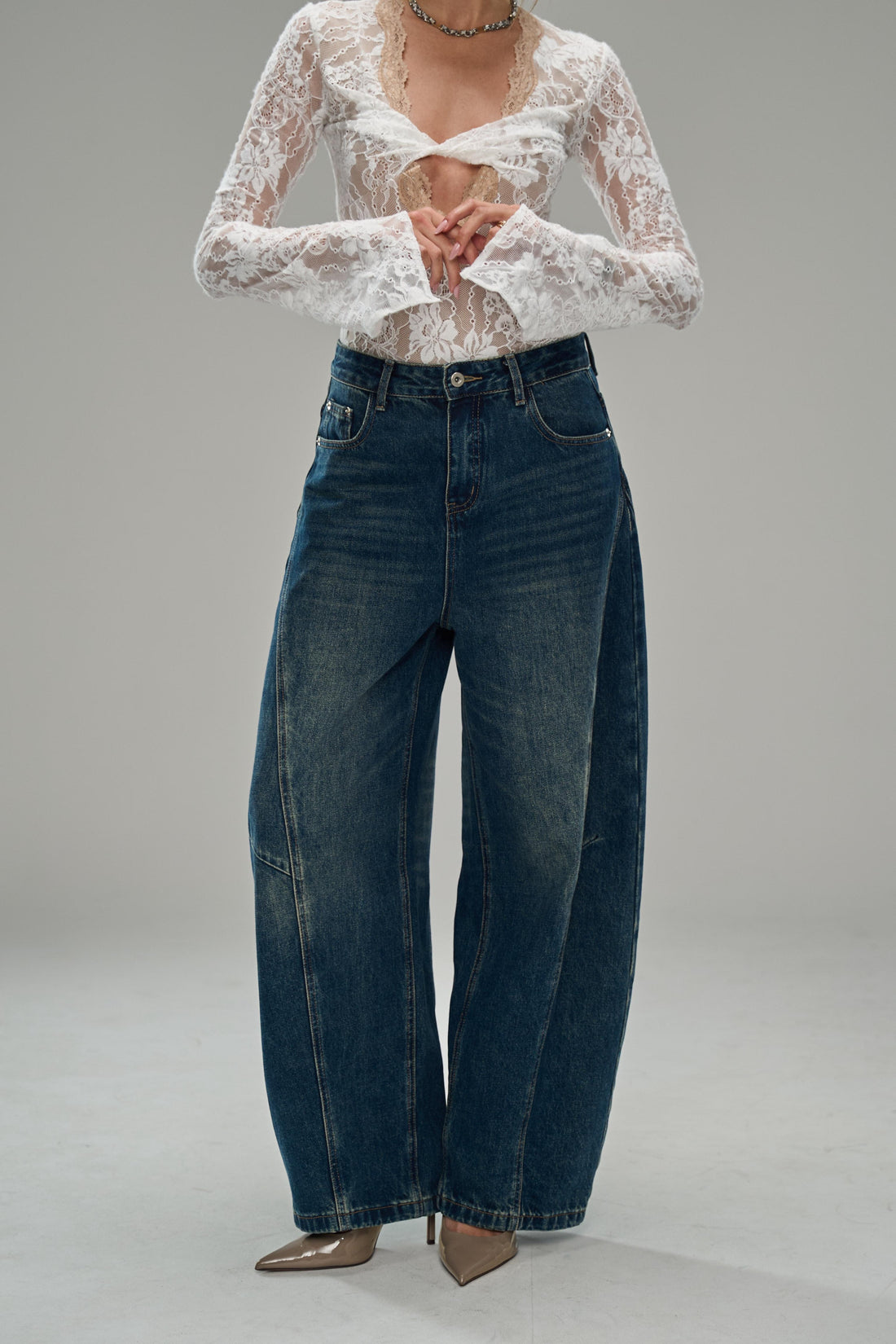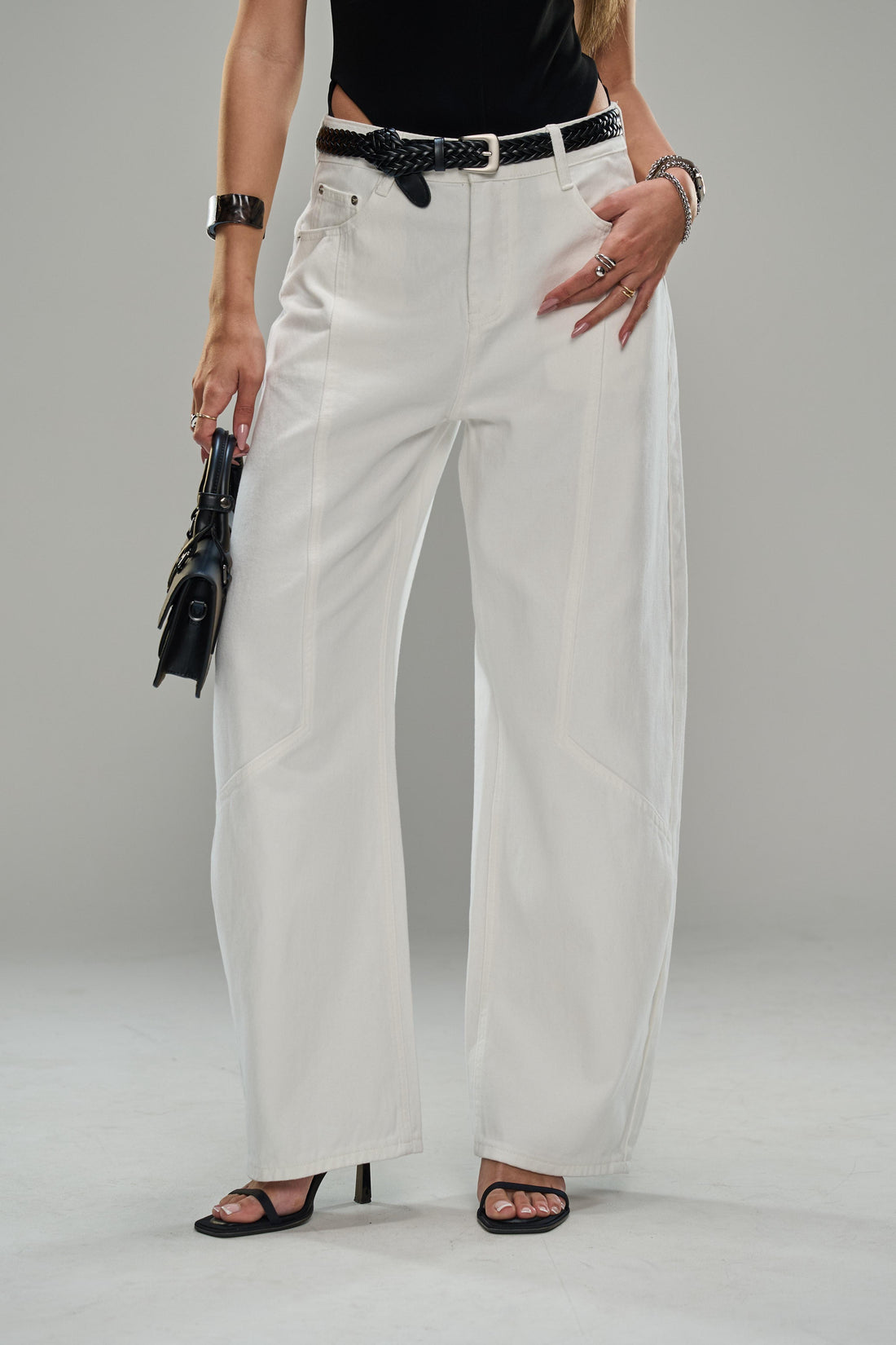 ג׳ינס בגזרה רחבה עם חגורת מותן צרה