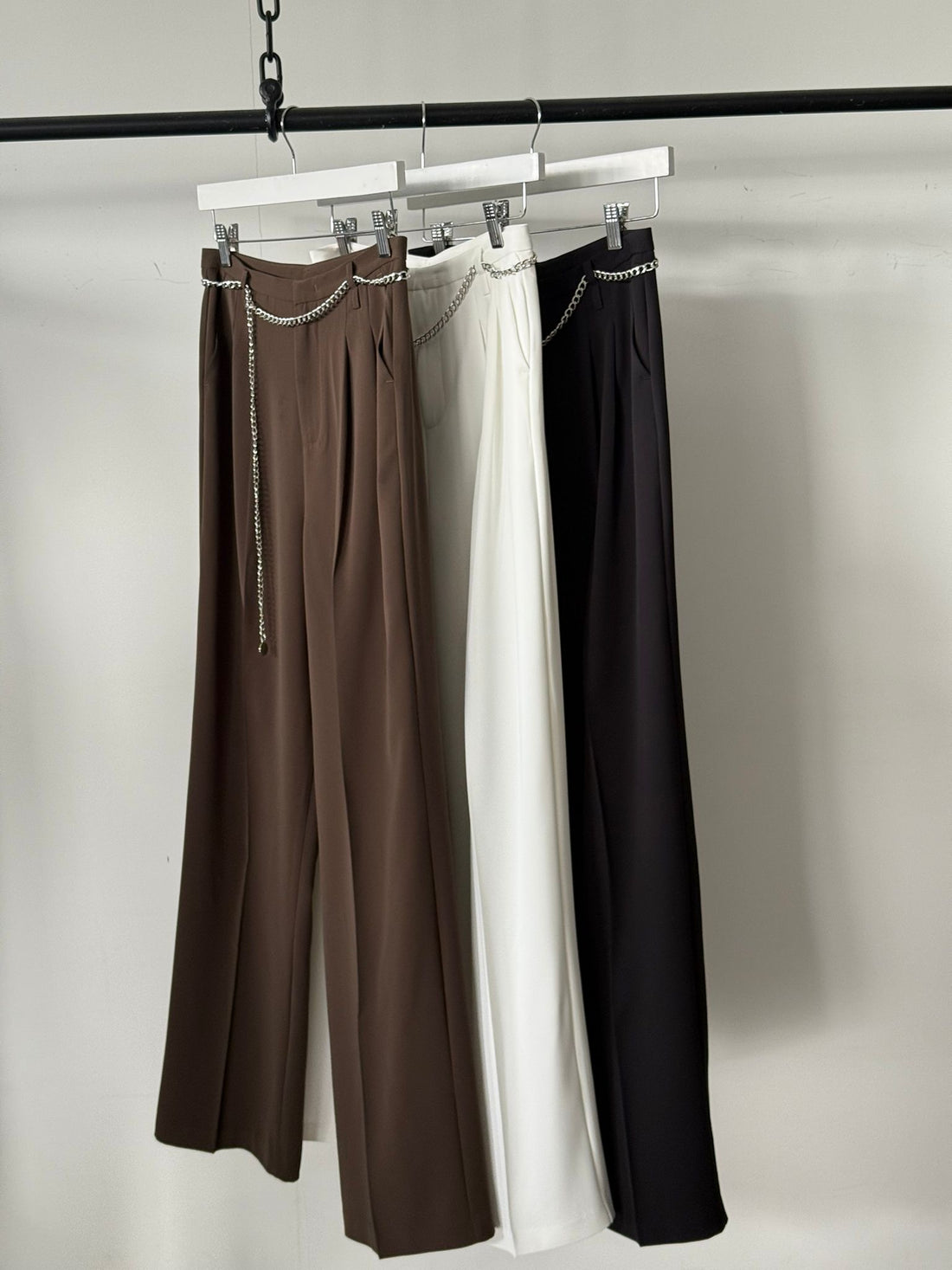 מכנס מחויט בגזרה ישרה מגיע עם חגורת שרשרת כסף דקה 95% כותנה 5% סטרץ הדוגמנית לובשת...