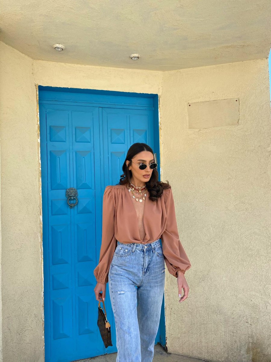 כיווצים בכתפיים שרוול ארוך דק עם גימור גומי