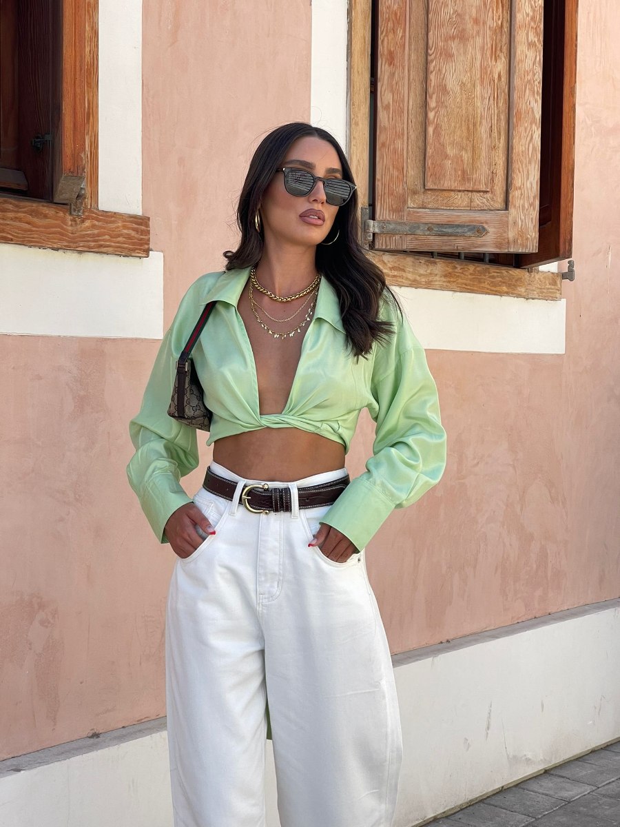 חולצה מבד סאטן בגזרת מעטפת בשילוב קשירה