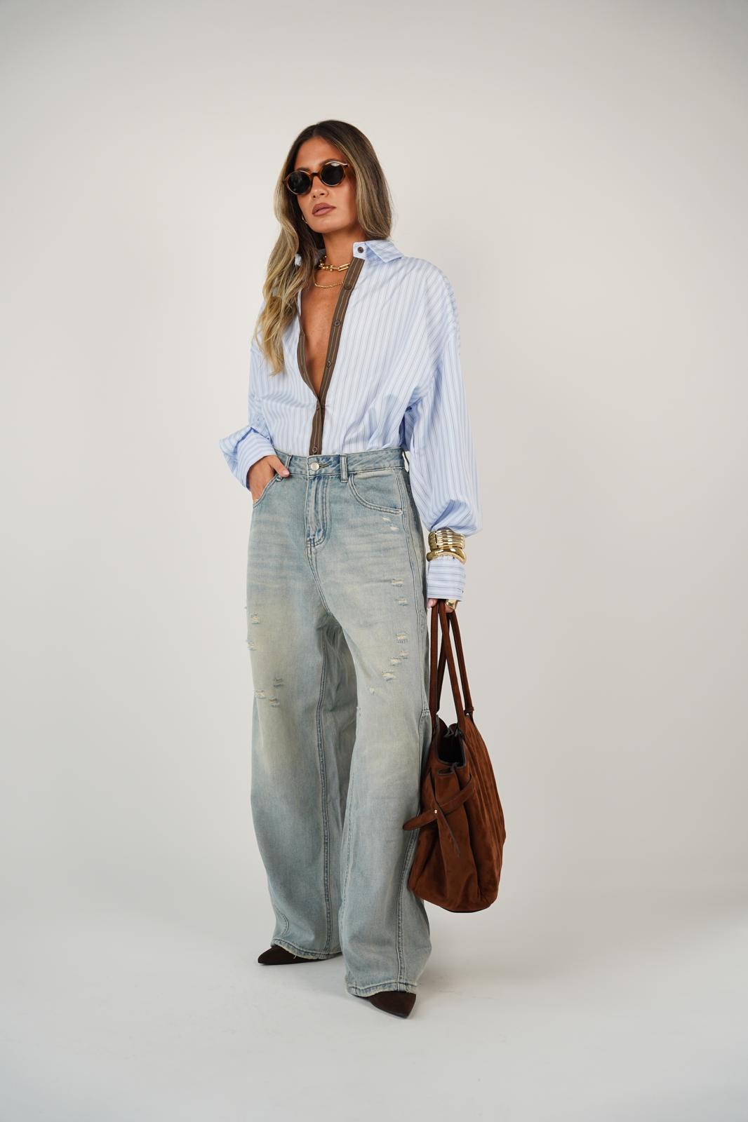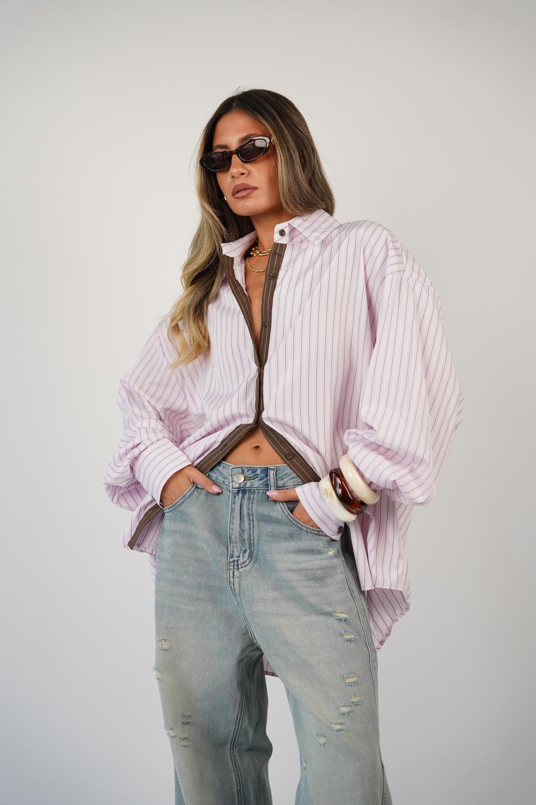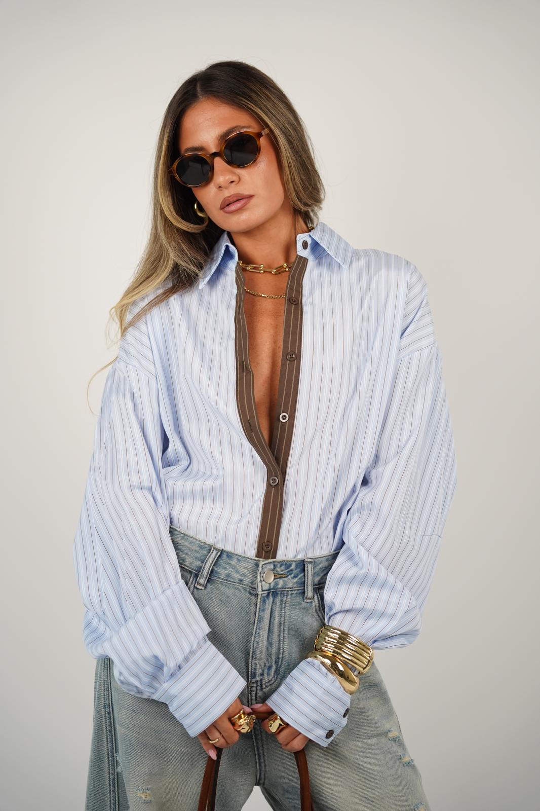 חולצת פסים מכופתרת עם שילוב של שינה בצבע חום