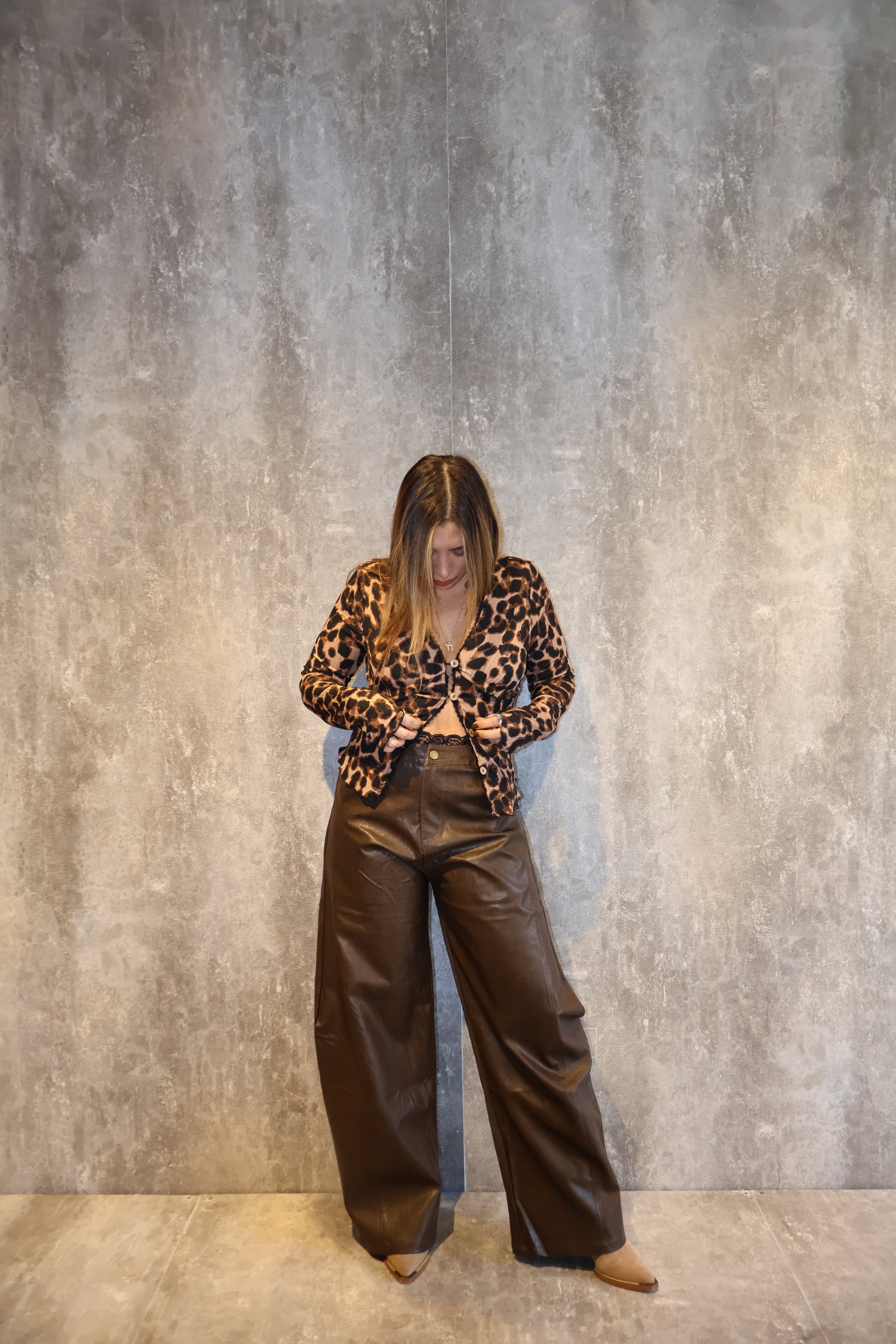 חולצה מכופתרת בהדפס מנומר שרוול מתרחב