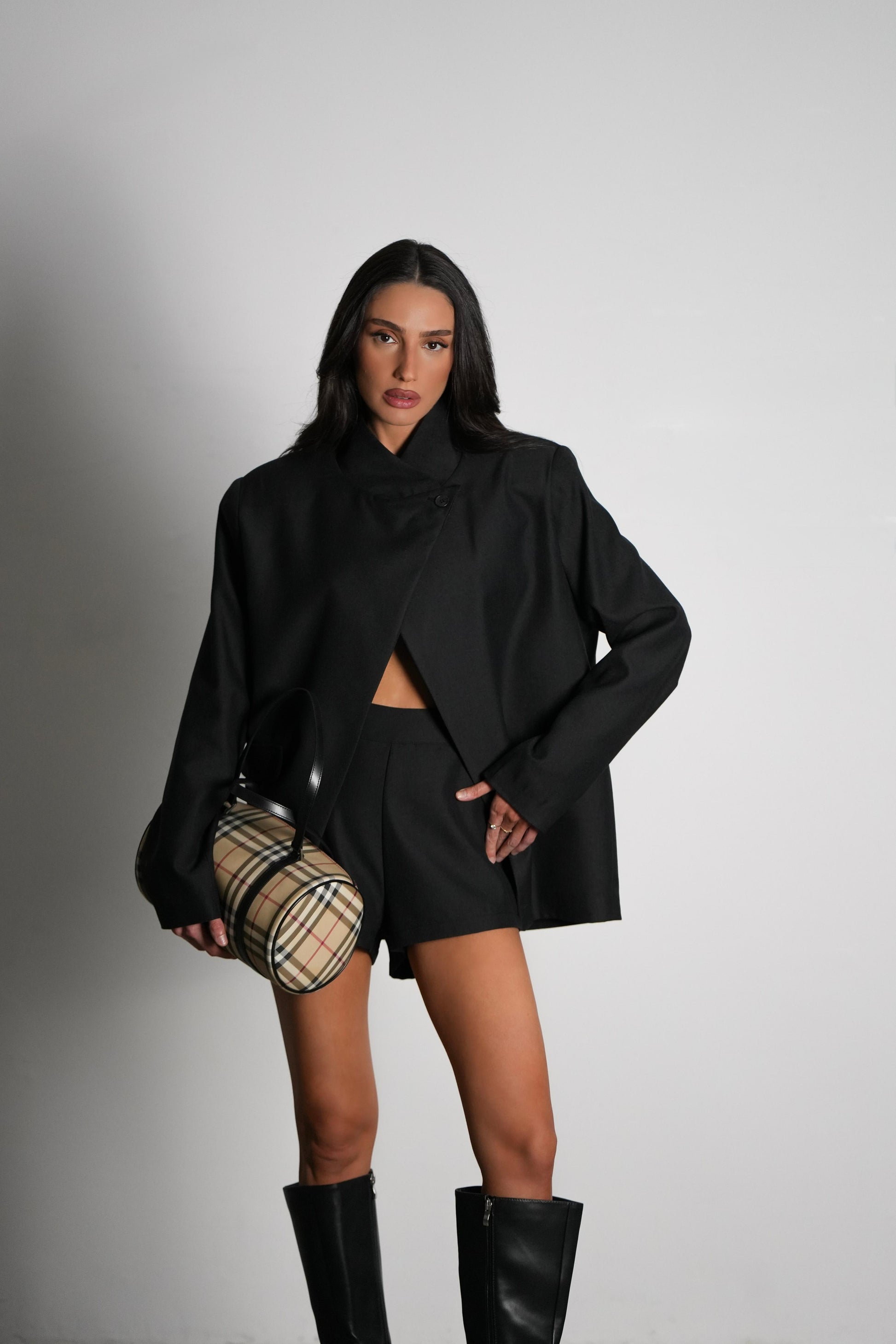 חליפת שורט מחויטת בשילוב ג׳קט תואם עם סגירה אלכסונית