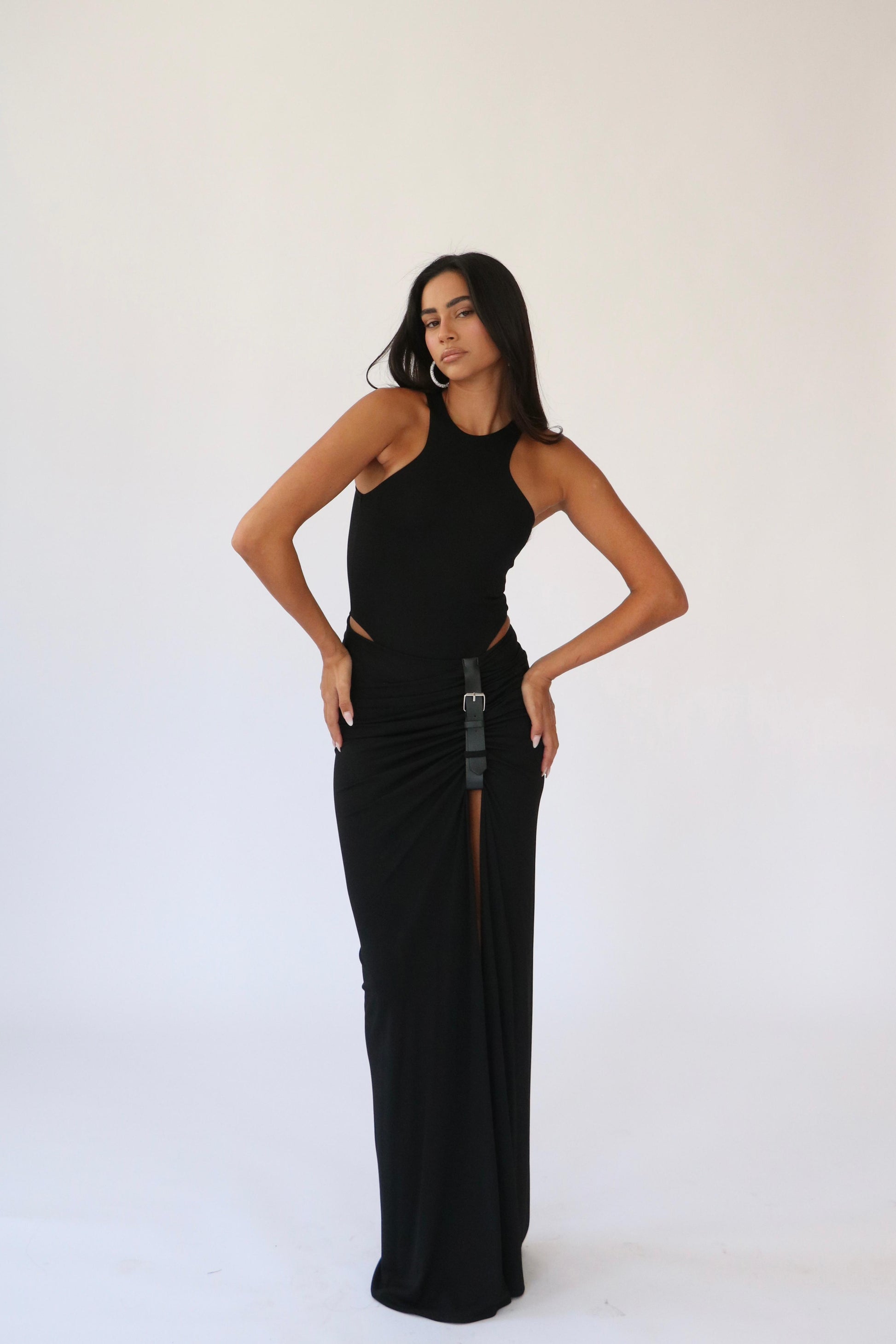 בשילוב חצאית מקסי עם שסע ושילוב חגורת עור