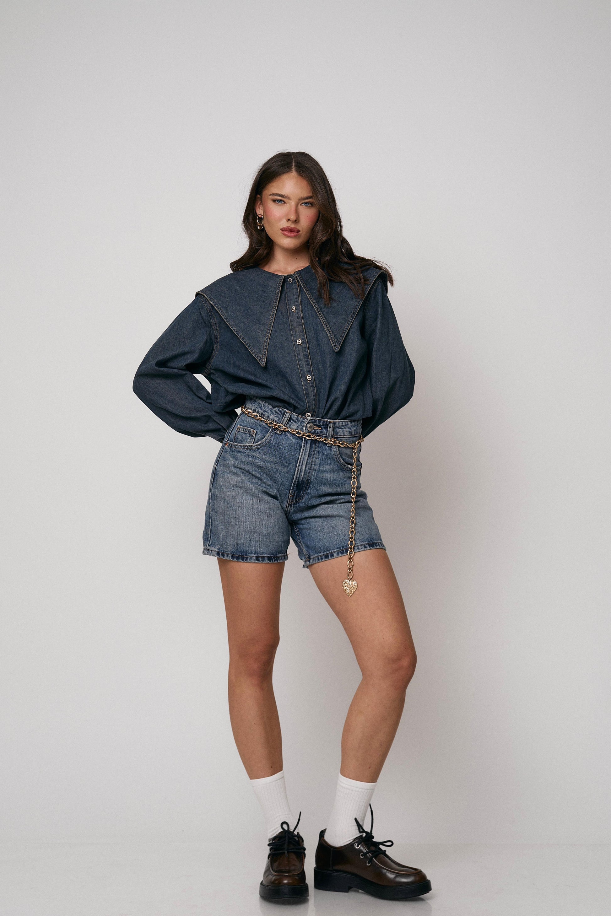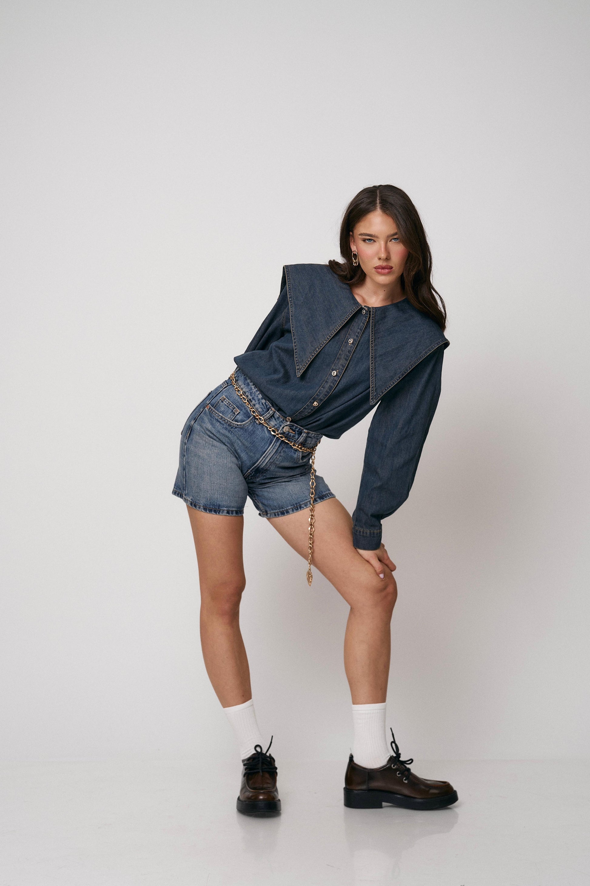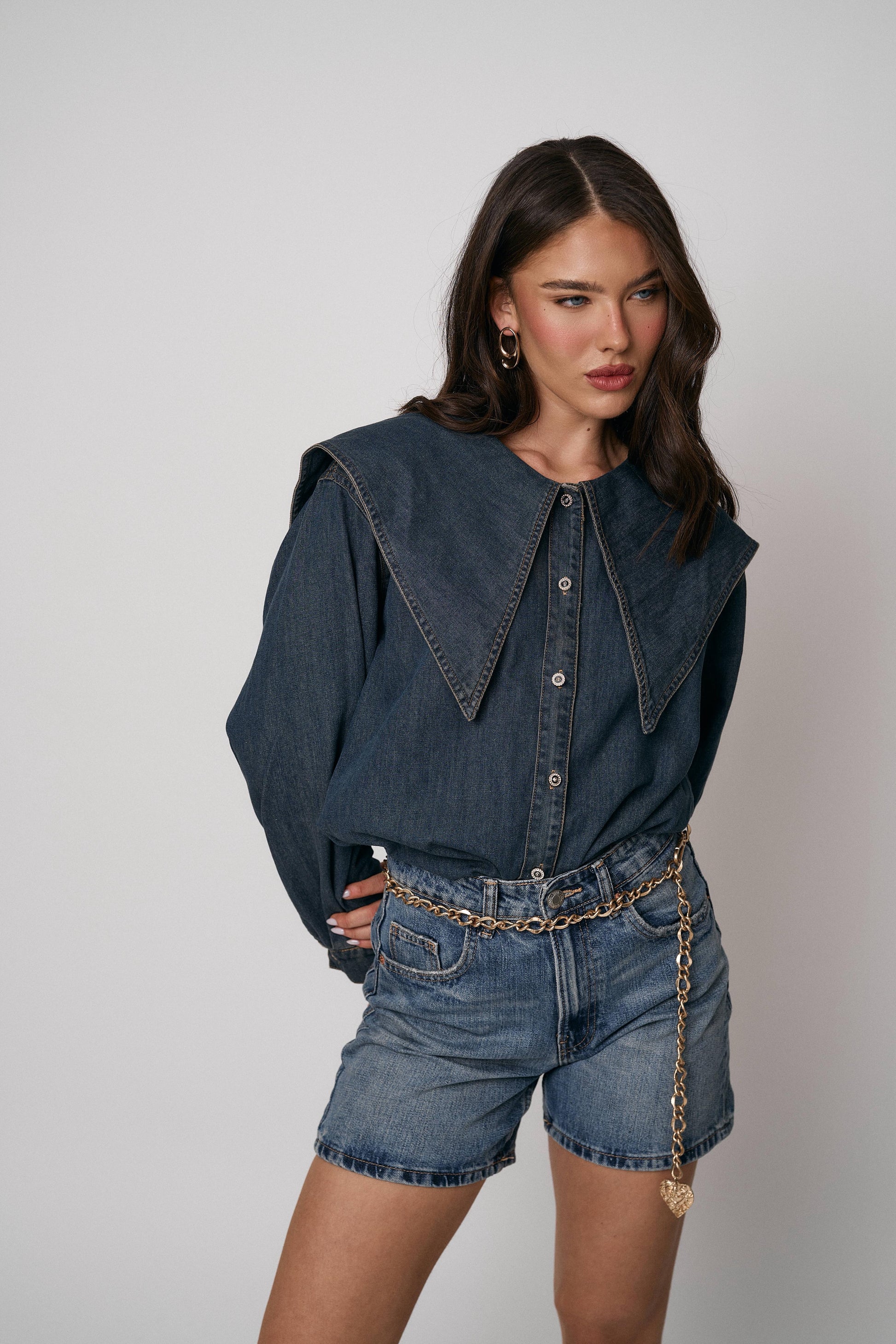 חולצה מכופתרת בד ג׳ינס 100% כותנה עם צווארון גדול