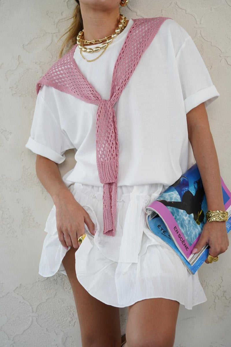 טישרט לבנה בגזרה אוברסייז מבד דק ואיכותי מאוד מגיע עם צעיף סרוג (לא מחובר)