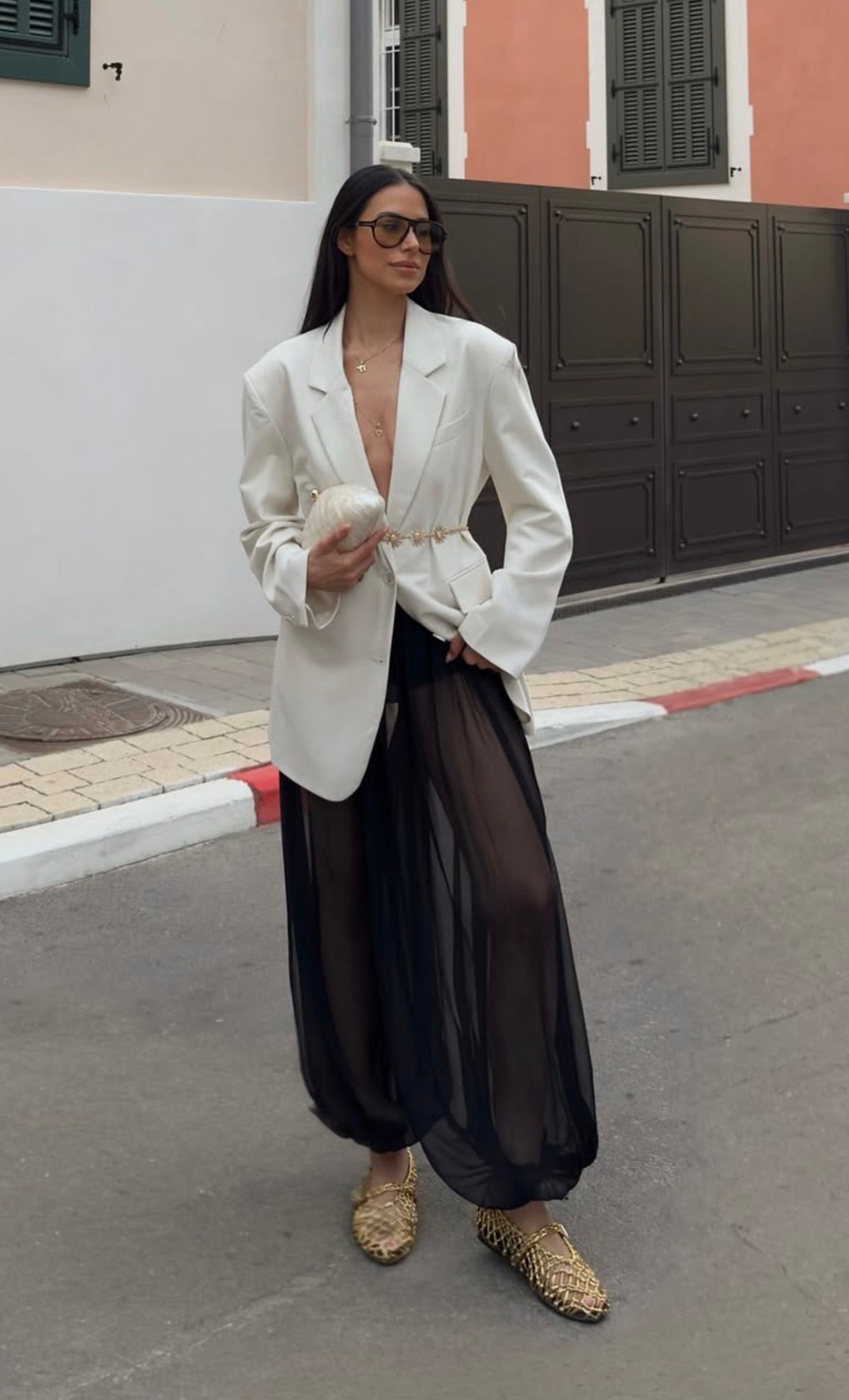 מכנס שיפון שקוף בגזרת בלון עם גומי במותן וגומי בסיומת