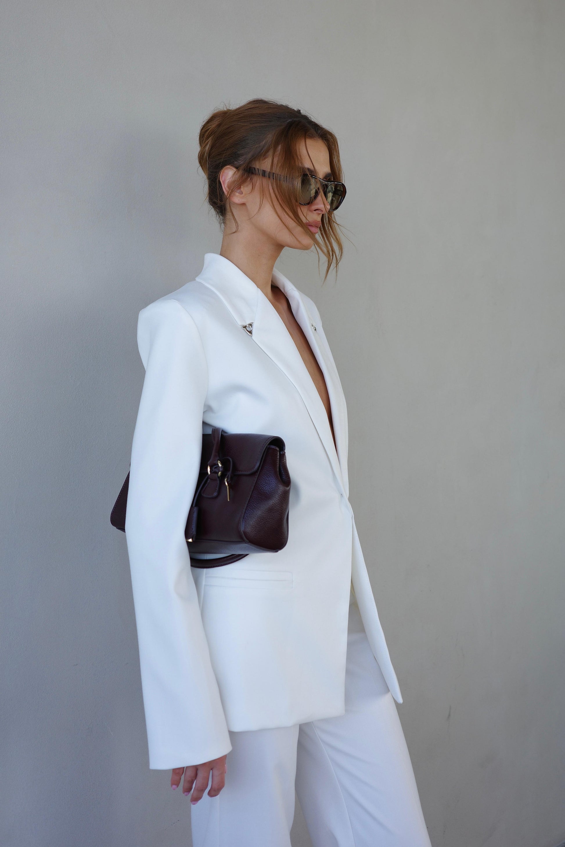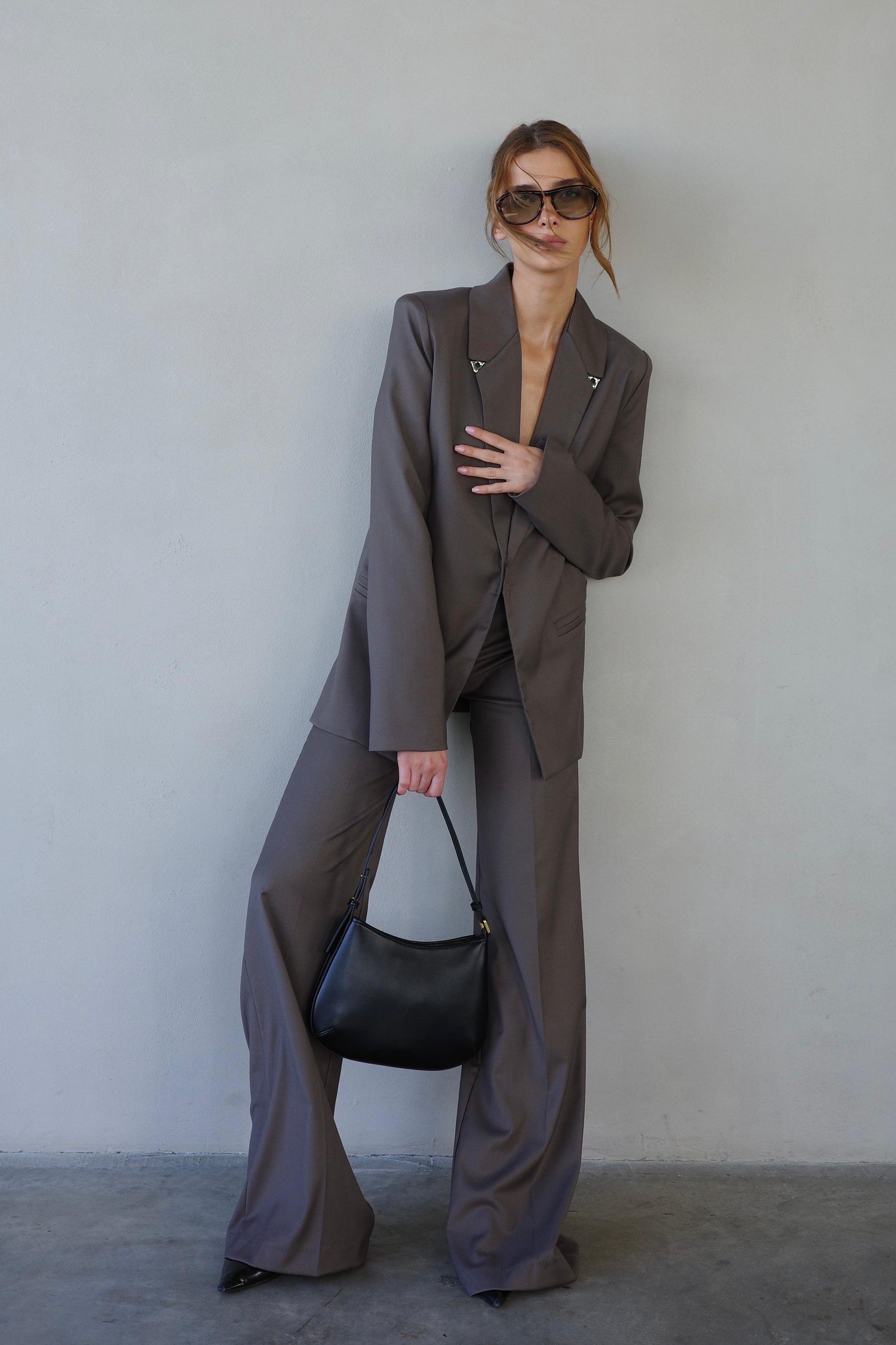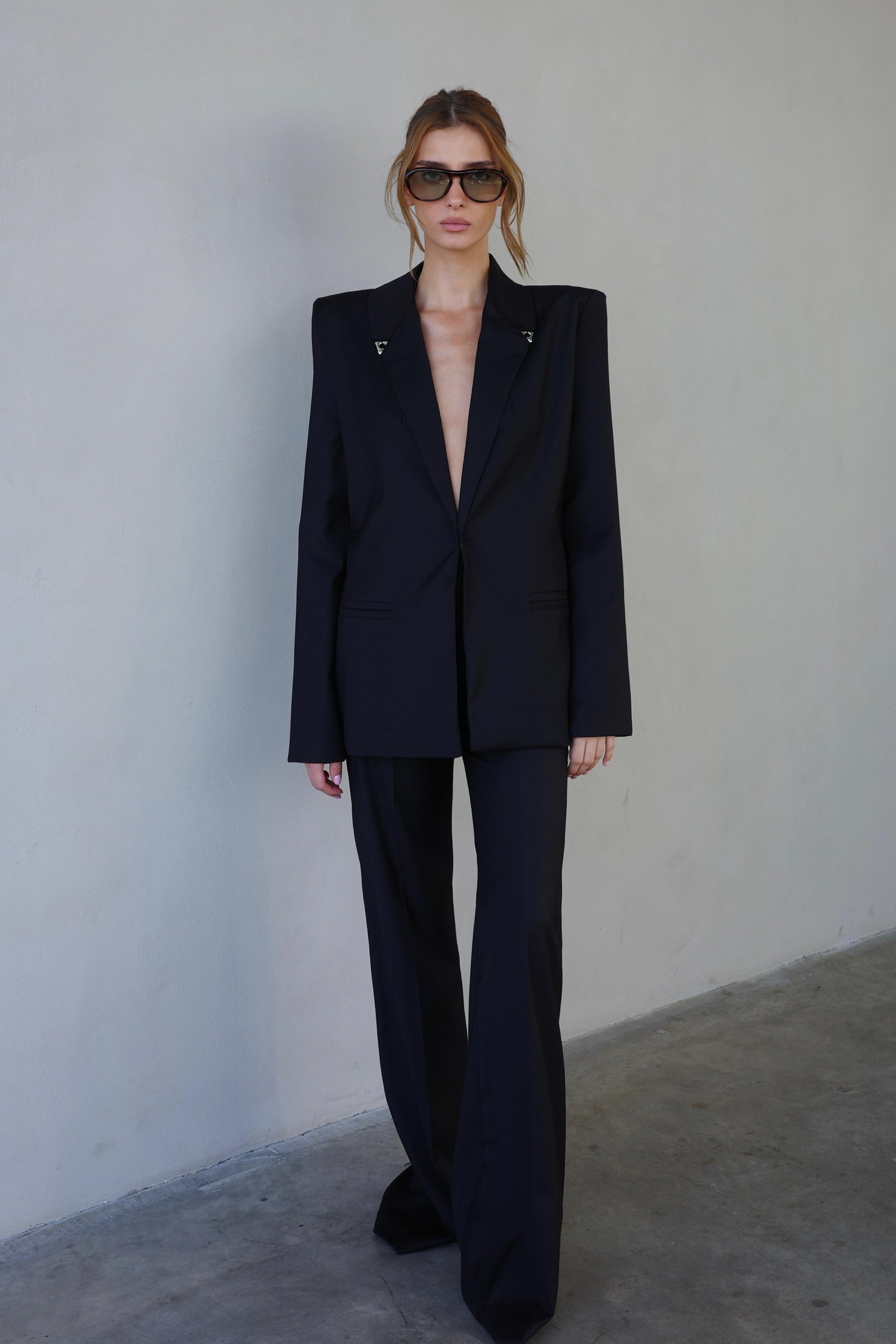 בלייזר מחויט עם אלמנטים כסופים בדש הצווארון