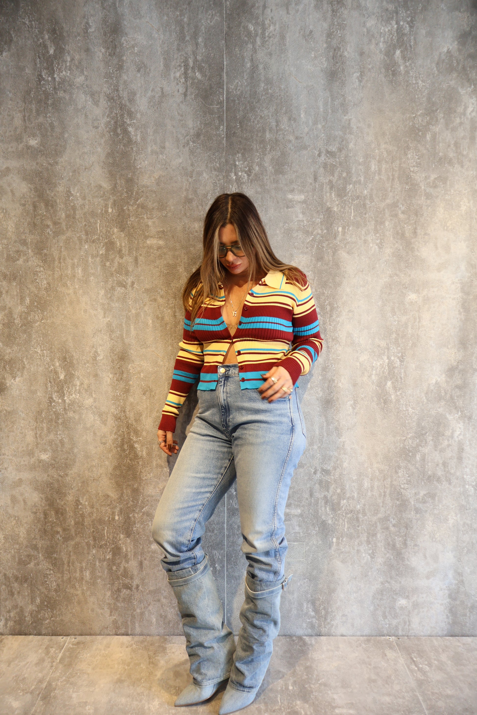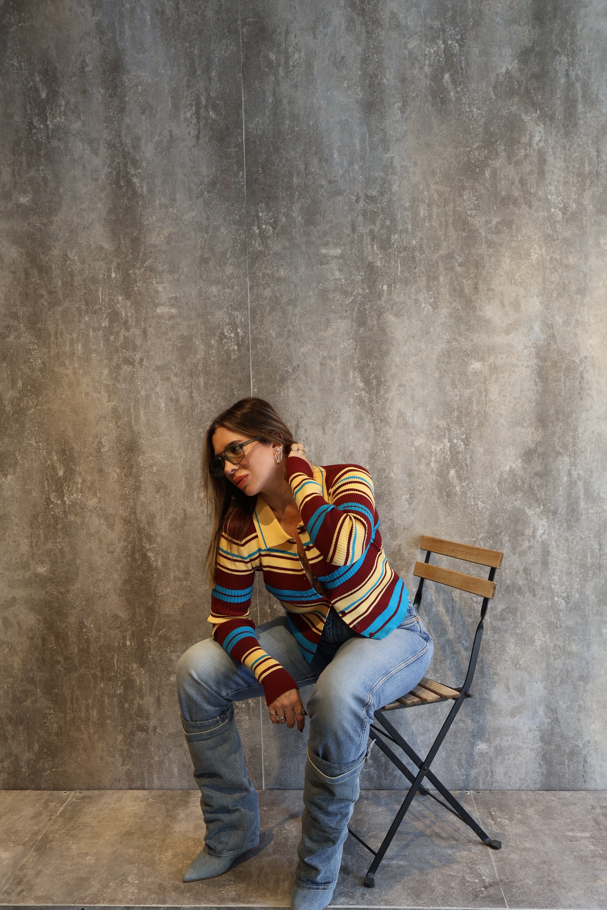 סריג עם סגירת כפתורים בסריגת פסים צבעוניים