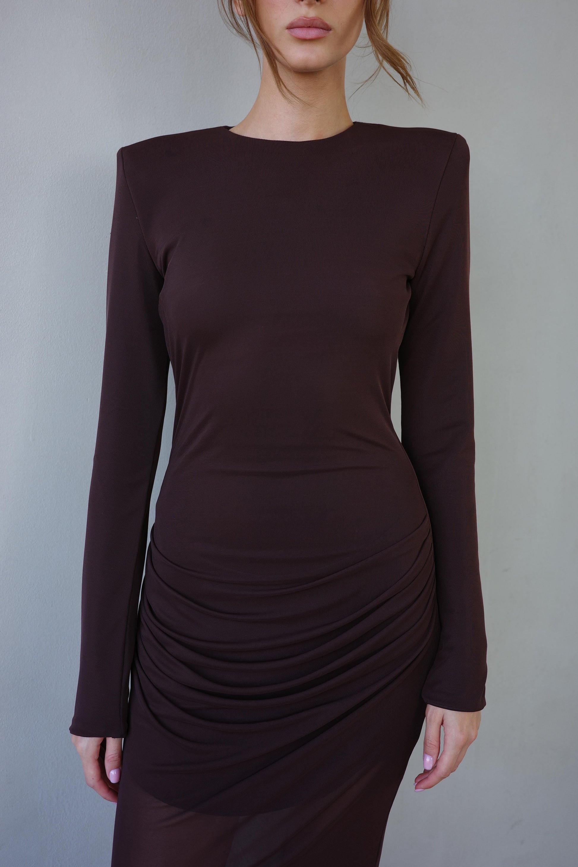 ועליה תפורה שכבת מקסי עם מעט שקיפות וכיווצים במותן